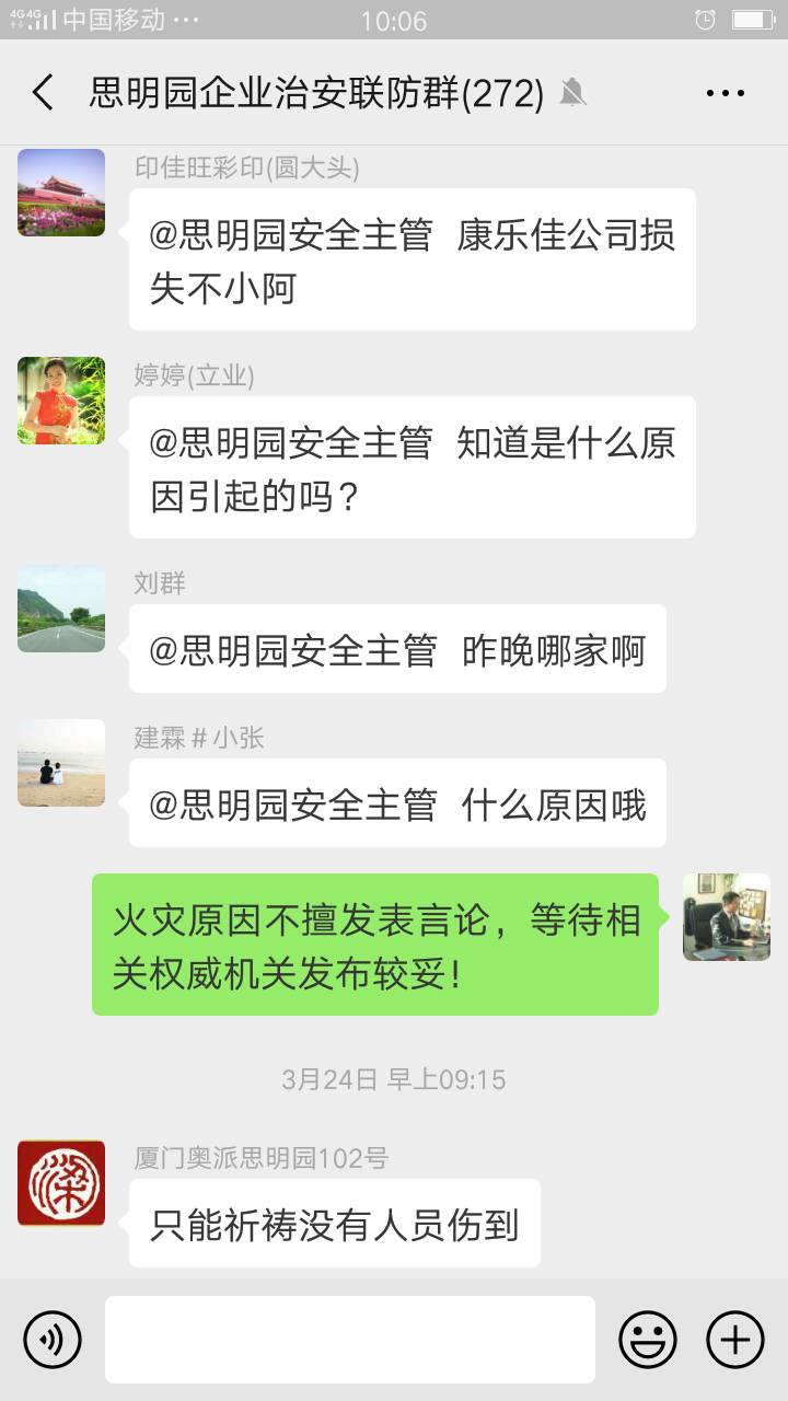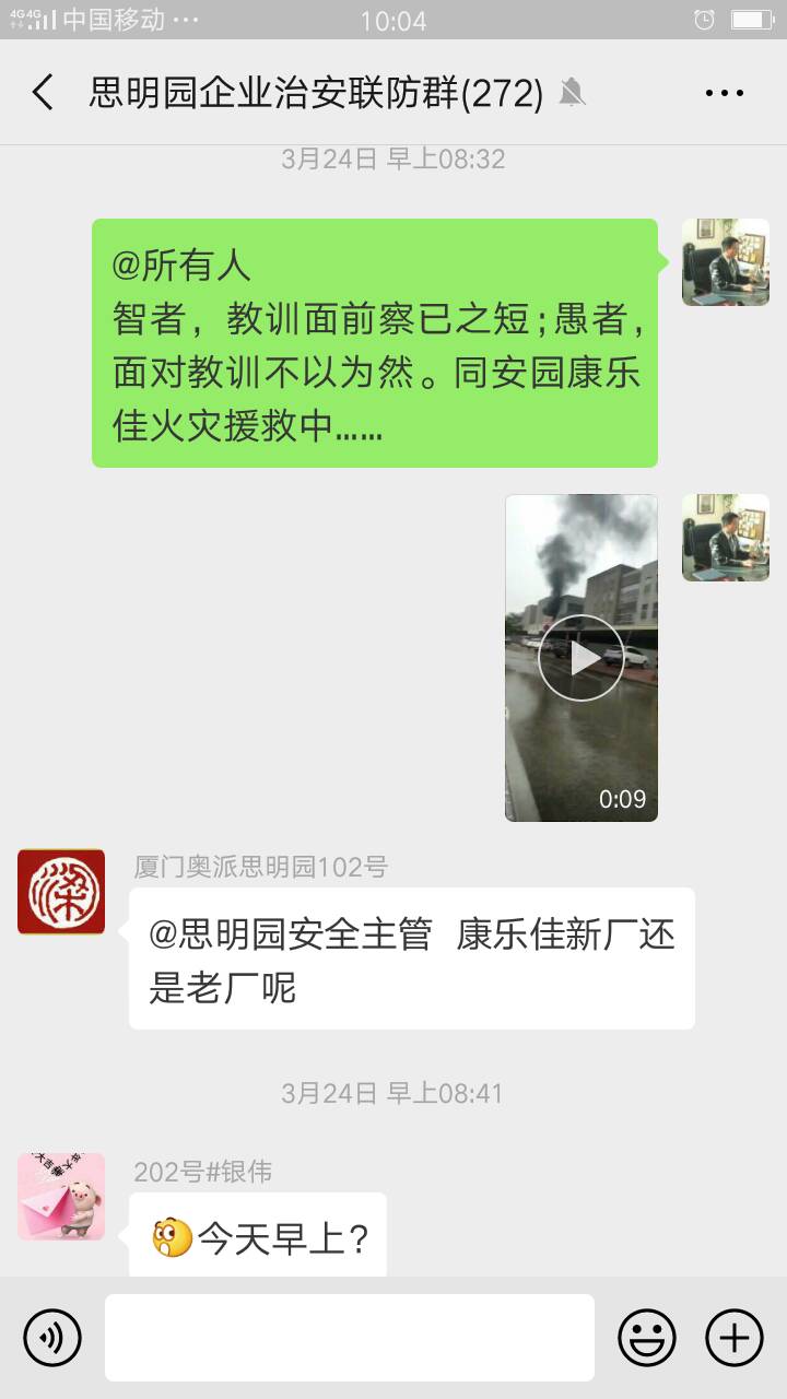 2019年3月24日8:30許,位于我司園區周邊的同安工業(yè)集中區同安園康樂(lè )佳公司發(fā)生火災。為了給園區內企業(yè)敲響警鐘,全和物業(yè)集中區思明園服務(wù)處在轄區“企業(yè)業(yè)主治安聯(lián)防微信群”里即時(shí)發(fā)布現場(chǎng)火災視頻動(dòng)態(tài)信息,以“微信現場(chǎng)會(huì )”的形式提醒轄區企業(yè)業(yè)主“提高消防意識,加強防火墻建設”。