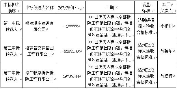 招標編號為廈至信施招[2019]第12號的觀(guān)音山C04地塊臨時(shí)建筑拆除工程建設項目,該工程建設項目施工招標于2019年6月26日依法公開(kāi)開(kāi)標后,評標委員會(huì )按照招標文件規定的評標標準和方法進(jìn)行了評審,根據評標委員會(huì )提交的書(shū)面評標報告,現將評標結果、否決其投標的投標人及否決原因公示如下: