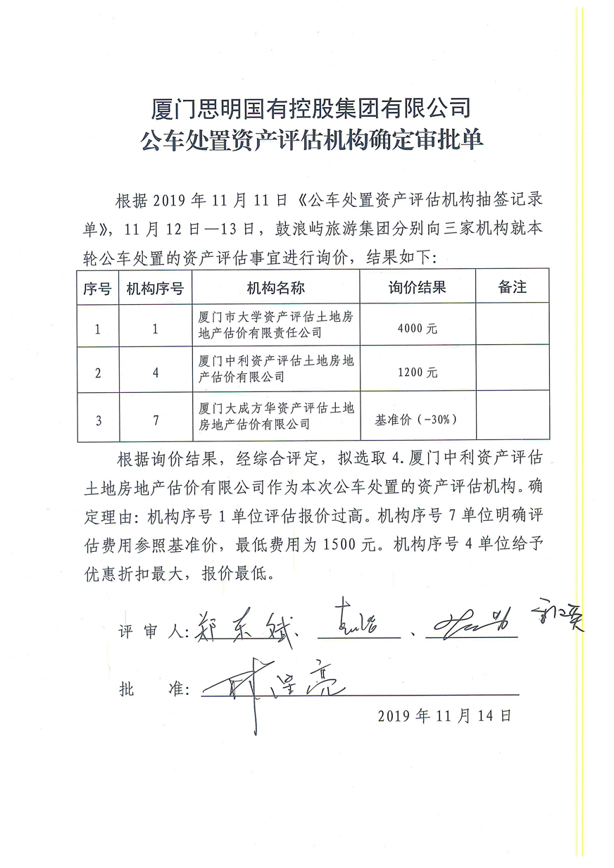 2.《思明控股公車(chē)處置(第四批)資產(chǎn)評估機構確定審批單》;