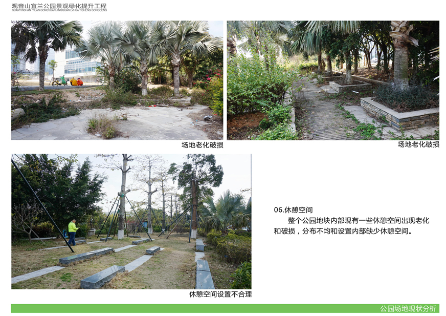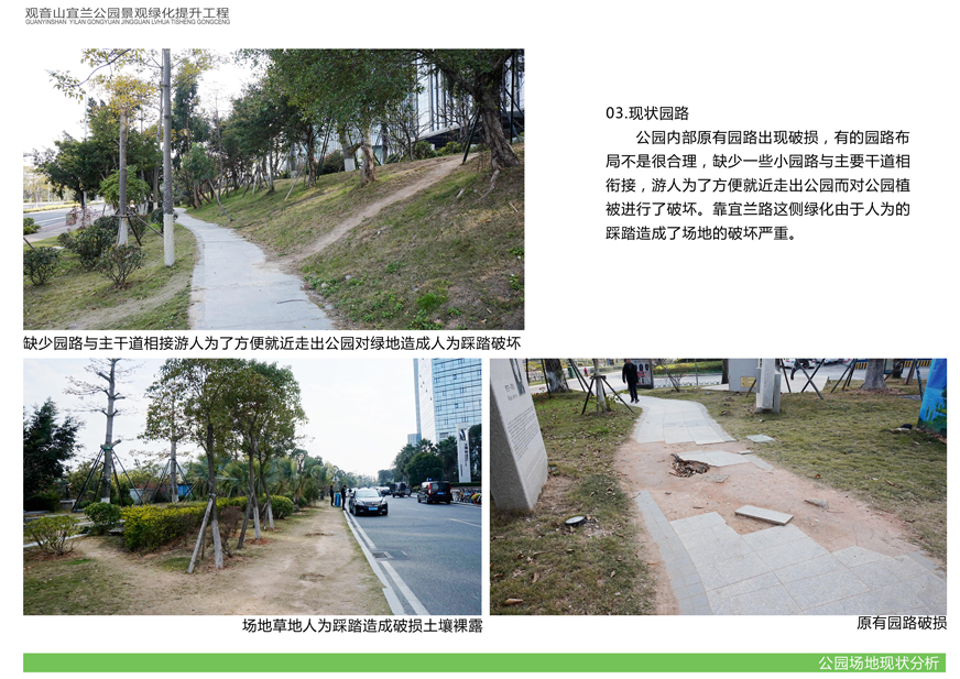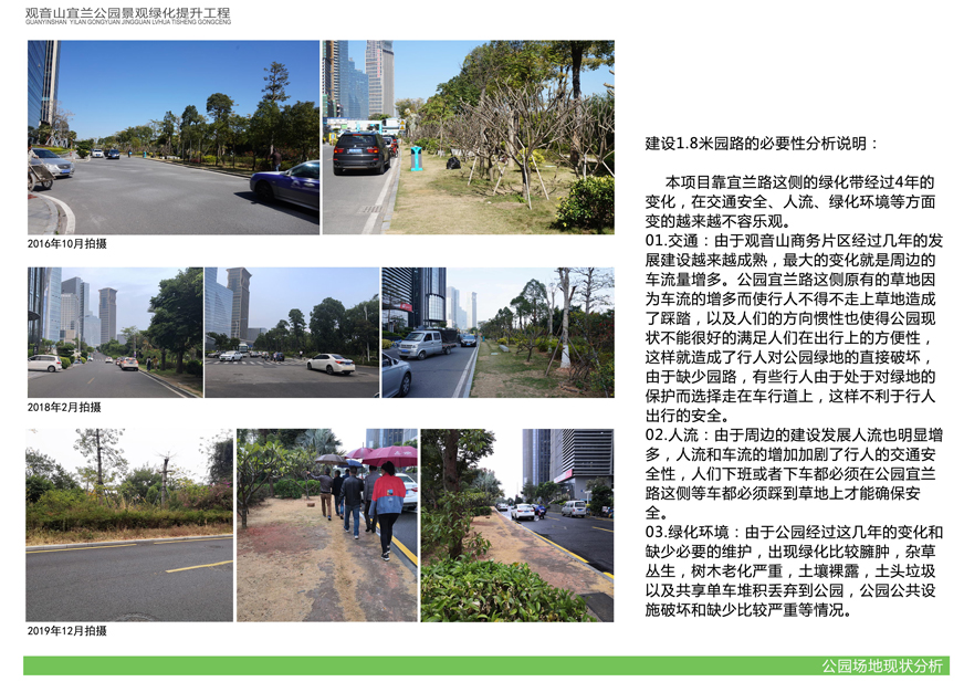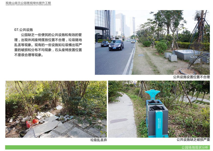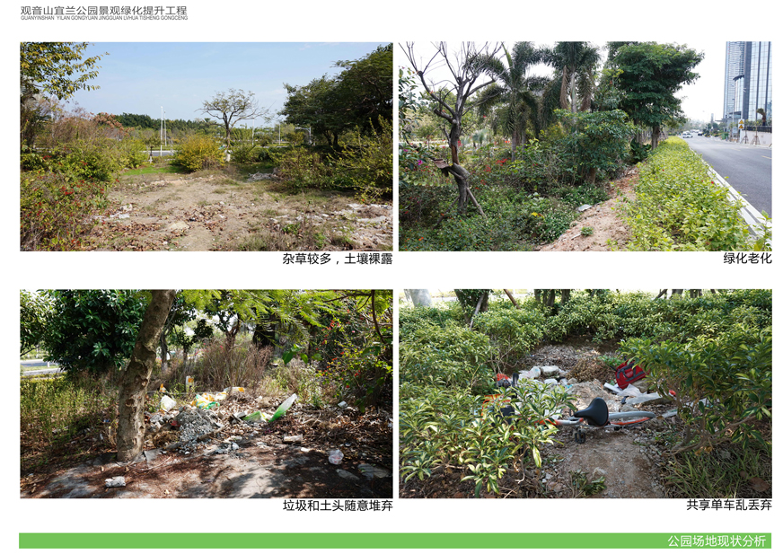 項目位于環(huán)島東路與觀(guān)音山商務(wù)營(yíng)運中心之間,緊鄰城市干道環(huán)島東路及市政道路宜蘭路。該區域景觀(guān)綠化目前存在植被缺少后期養護,雜草較多,并出現倒伏現象,影響人行交通;各類(lèi)設施老化,景觀(guān)帶內垃圾無(wú)人清除,造成環(huán)境污染;區域兩側靠近車(chē)行道,缺少必要的人行園路,安全性較差;配套設施不完善,澆灌系統布局不合理等問(wèn)題,嚴重影響城市形象,因此對現狀綠化進(jìn)行整治十分必要。