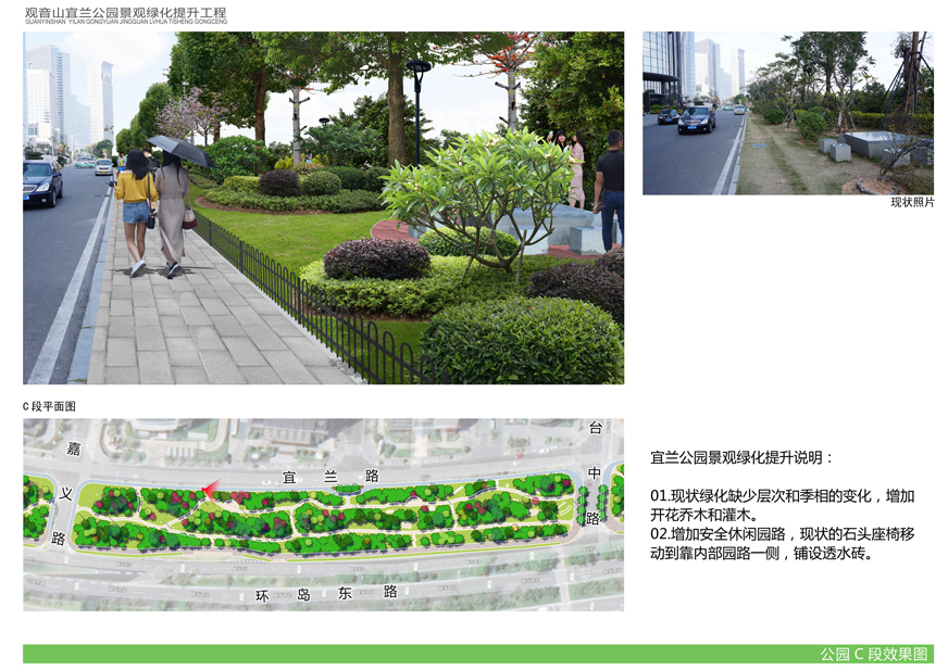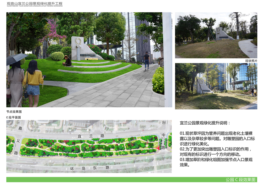 為切實(shí)改善上述問(wèn)題,提升觀(guān)音山片區辦公環(huán)境檔次,廈門(mén)市開(kāi)元國有投資集團有限公司擬對觀(guān)音山宜蘭公園進(jìn)行綠化提升,并委托廈門(mén)市城邦園林規劃設計研究院有限公司進(jìn)行了方案設計。根據廈府辦[2019]115號文要求,現將設計方案予以公布并廣泛征求意見(jiàn)。