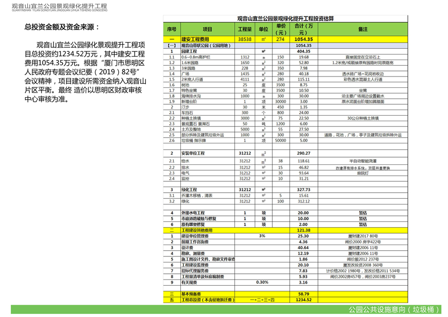 觀(guān)音山宜蘭公園景觀(guān)綠化提升工程由我司下屬廈門(mén)市開(kāi)元國有投資集團有限公司負責建設,項目投資估算為1234.52萬(wàn)元。