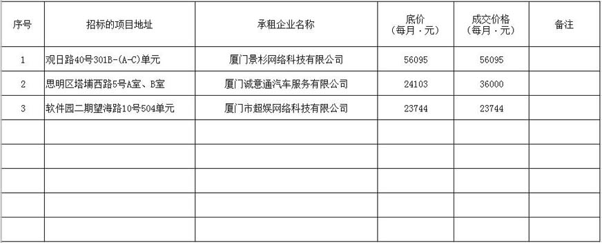 根據思明區國有企業(yè)資產(chǎn)出租管理的相關(guān)制度,我司2020年4月9日上午9:00起于觀(guān)音山營(yíng)運中心2號樓2層2號會(huì )議室進(jìn)行公開(kāi)招租現場(chǎng)開(kāi)標,現通過(guò)思明控股網(wǎng)站對外發(fā)布成交公告,內容如下: