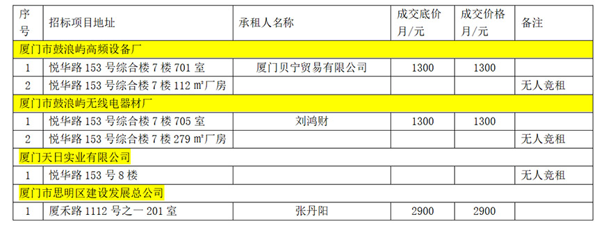 思明區區屬托管企業(yè)公開(kāi)招租成交公告