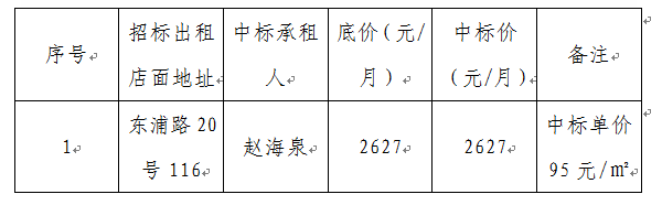 根據思明區國有企業(yè)資產(chǎn)出租管理的相關(guān)制度,我公司于2020年12月18日10:00在廈門(mén)市禾祥西路51號10A中山房地產(chǎn)公司會(huì )議室,進(jìn)行浦南安置小區東浦路20號103等13間店面公開(kāi)招租現場(chǎng)開(kāi)標。僅一間店面成交,其余12間店面因無(wú)人應標而流標?,F通過(guò)思明控股網(wǎng)站對外發(fā)布成交公告,內容如下:
