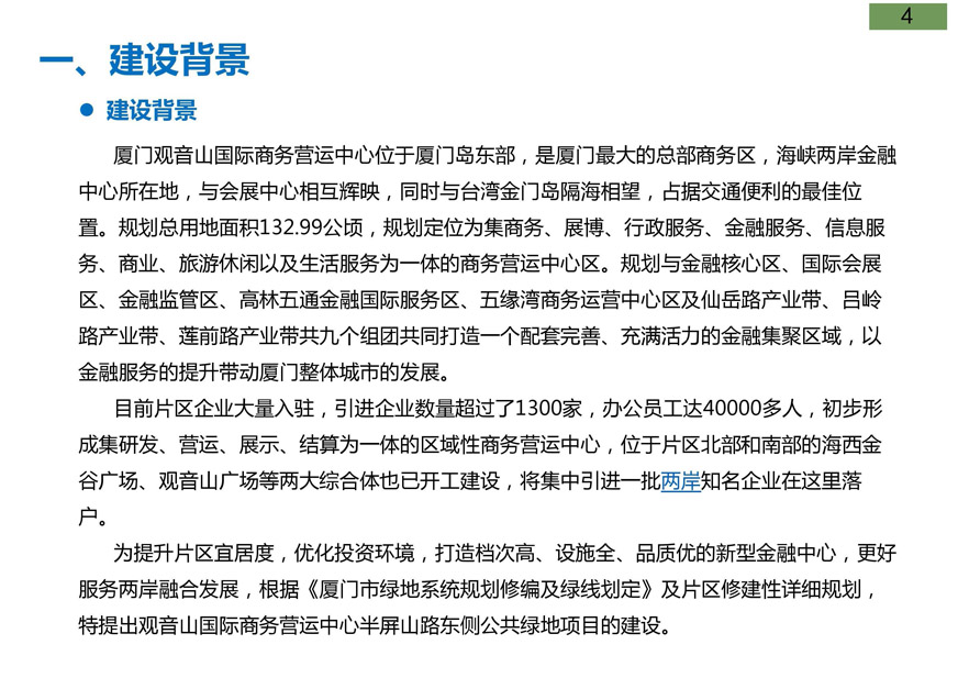 觀(guān)音山片區作為兩岸金融中心片區重要組成部分,公共綠地建設、養護水平的高低關(guān)系到兩岸金融中心建設的品質(zhì)。為提升片區景觀(guān)形象,優(yōu)化投資環(huán)境,根據《廈門(mén)市綠地系統規劃修編及綠線(xiàn)劃定》及片區修建性詳細規劃,廈門(mén)市開(kāi)元國有投資集團有限公司擬建設觀(guān)音山國際商務(wù)營(yíng)運中心半屏山路東側公共綠地項目,并委托上海東方設計研究院進(jìn)行了方案設計。根據廈府辦[2019]115號文要求,現將設計方案予以公布并廣泛征求意見(jiàn)。