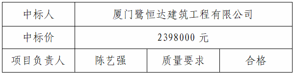 招標項目編號為“(2021-ZWJ017曾厝垵4#樓玩月坡餐廳裝修工程”的招標,招標人根據評標委員會(huì )推薦的中標候選人確定本項目中標人,于2021年04月30日至2021年05月03日止進(jìn)行公示,中標人的中標情況公布如下: