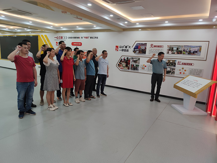 隨著(zhù)參觀(guān)接近尾聲時(shí),在這重要的時(shí)刻,重要的地點(diǎn),黨支部書(shū)記陳睿武帶領(lǐng)大家,面向黨旗,莊嚴地舉起右手,握拳宣誓,重溫入黨誓詞:“我志愿加入中國共產(chǎn)黨,擁護黨的綱領(lǐng),遵守黨的章程,履行黨員義務(wù),執行黨的決定,嚴守黨的紀律,保守黨的秘密,對黨忠誠,積極工作……”短短的80個(gè)字,句句千鈞、擲地有聲,讓全體黨員再次接受洗禮,銘記莊嚴的承諾,牢記共產(chǎn)黨員的初心和使命,堅定對黨的事業(yè)奮斗終生的決心。參觀(guān)結束后,大家也紛紛表示將會(huì )從深田社區的紅色印記中汲取力量,牢記初心使命,以更飽滿(mǎn)的熱情積極投身到工作中去,切實(shí)發(fā)揮黨員的先鋒模范作用,為企業(yè)的發(fā)展添磚加瓦。