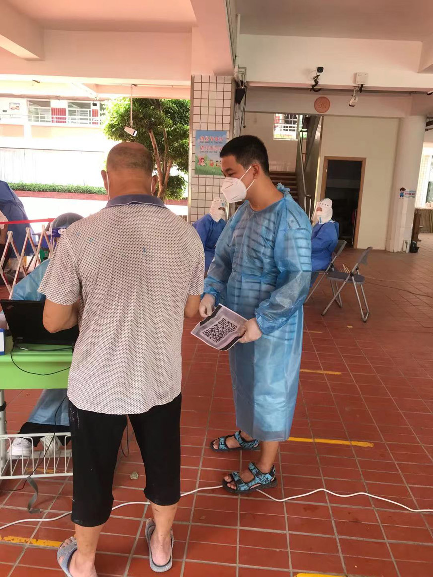 盡管隊員們幾乎徹夜未眠,31日清晨7點(diǎn),湖明小學(xué)門(mén)口,全和第一支抗疫志愿者隊伍10人全部準時(shí)集結到位。在領(lǐng)隊招商部經(jīng)理邱慧瓊的帶領(lǐng)下,主動(dòng)對接街道社區工作人員,領(lǐng)取工作任務(wù)。很快,隊員們各就各位、迅速上崗,與醫務(wù)人員、社區工作人員擰成一股繩:測量體溫、維持秩序;指引登記、答疑解惑;上門(mén)動(dòng)員、分批引導,登記錄入,面對不會(huì )用手機預約的老人、預約條形碼不規范的群眾,隊員們細致耐心地指導、不厭其煩地重復答疑,用微笑化解疫情之下群眾的焦躁心情,全力協(xié)助核酸檢測工作,用實(shí)際行動(dòng)踐行國企擔當。