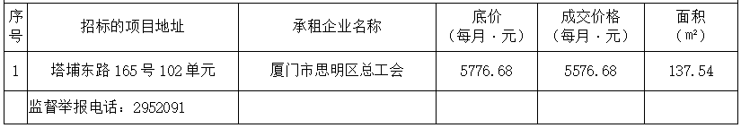 根據思明區國有企業(yè)資產(chǎn)出租管理的相關(guān)制度,我司2021年8月13日上午9:00起于觀(guān)音山營(yíng)運中心7號樓2層會(huì )議室進(jìn)行公開(kāi)招租現場(chǎng)開(kāi)標,現通過(guò)思明控股網(wǎng)站對外發(fā)布成交公告,內容如下: