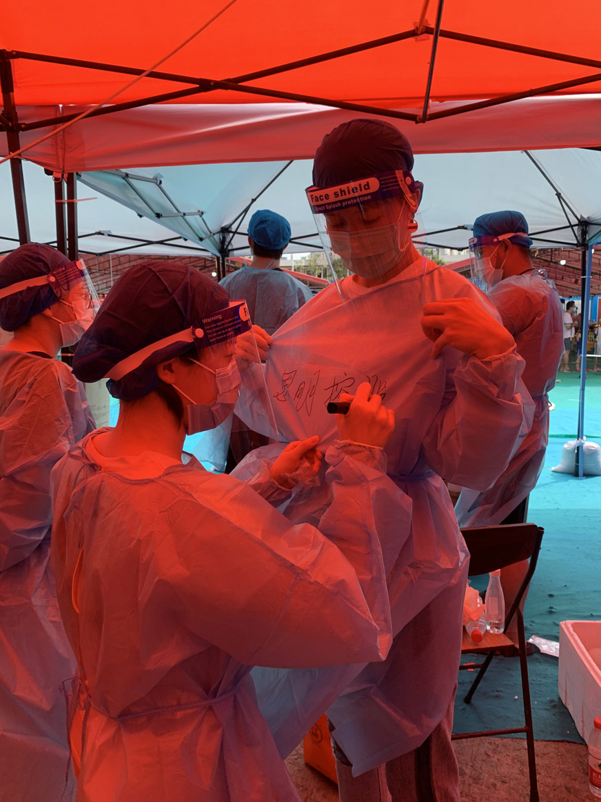 夜幕降臨,當日的檢測工作也接近尾聲。吹著(zhù)初秋的晚風(fēng),看繁星閃爍。脫下悶熱的隔離衣,卸下了一天的防備??粗?zhù)彼此被勒出痕跡的臉龐和手套下發(fā)白發(fā)皺的雙手,我們更加堅定了殲滅疫情的決心。