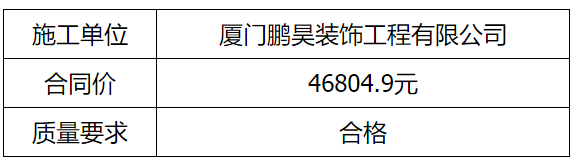 根據招投標管理辦法、思明控股辦[2021]14號文《采購招標管理辦法》的相關(guān)規定,我司負責龍山文創(chuàng )園工業(yè)設計中心LED拆除、墻面及自動(dòng)玻璃門(mén)框補漆、花壇修補、雨水溝蓋更換上漆、圓形拱門(mén)沖洗等工程直接發(fā)包廈門(mén)鵬昊裝飾工程有限公司實(shí)施,現通過(guò)思明控股網(wǎng)站于2021年12月27日至2021年12月30日進(jìn)行成交結果公示,內容如下: