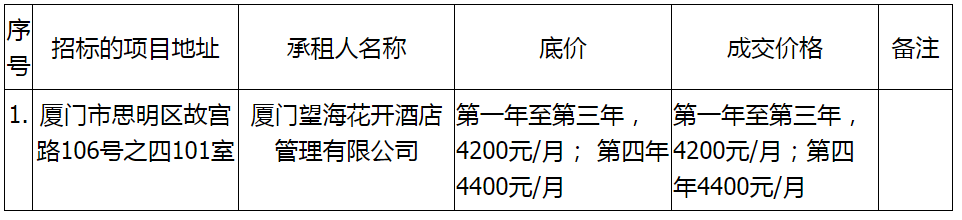 根據思明區國有企業(yè)資產(chǎn)出租管理的相關(guān)制度,我司于2021年12月31日上午9:00起在廈門(mén)市前埔工業(yè)園1號全和公司六樓會(huì )議室進(jìn)行公開(kāi)招租現場(chǎng)開(kāi)標,現通過(guò)思明控股網(wǎng)站對外發(fā)布成交公告,內容如下: