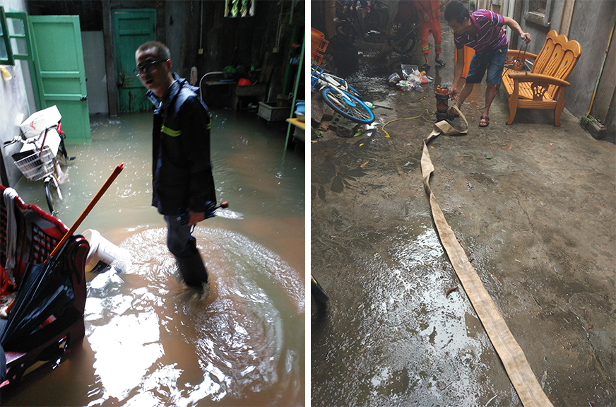 當工作人員巡查至雙蓮池時(shí),雙蓮池已成一片澤國,而雙蓮池52號更是猶如海中孤島一樣積水極深,工作人員不顧積水之深,穿過(guò)過(guò)膝的積水來(lái)到住戶(hù)家中,拿起掃把、拖把幫忙掃除房屋內的積水,并向上級申請抽水泵排水已解燃眉之急。經(jīng)過(guò)工作人員與住戶(hù)的不懈努力,積水終于被清理干凈,也還住戶(hù)一個(gè)安心的家。