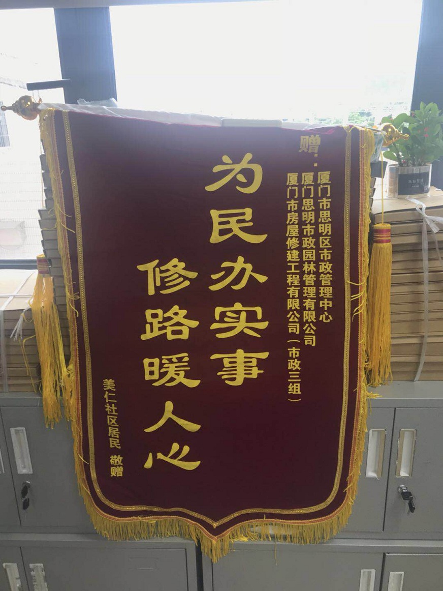 日前,思明市政園林管理有限公司收到了美仁社區居民送來(lái)的一面寫(xiě)有“為民辦實(shí)事 修路暖人心”的錦旗,對公司在美仁社區進(jìn)行的老舊小區市政設施管養和提升工作表示了衷心的感謝。