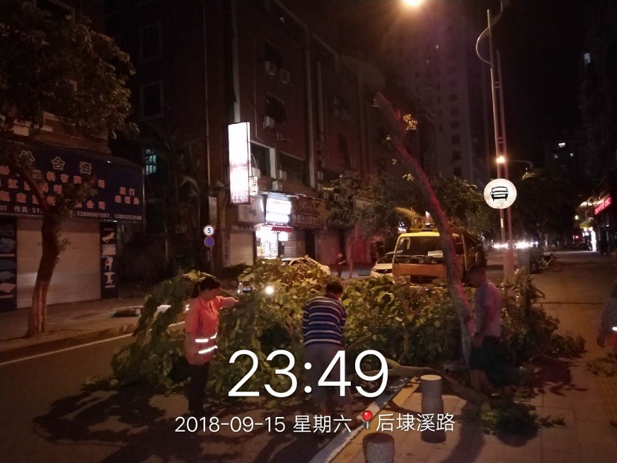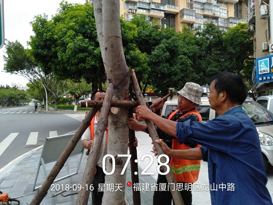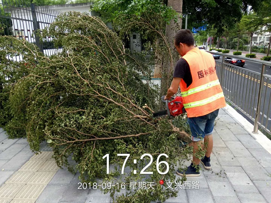 9月15日上午,氣象局發(fā)布“臺風(fēng)預警Ⅲ級”,我司迅速響應,綠化部人員第一時(shí)間抵達一線(xiàn),確保隊伍、設備以及防護措施全部準備就緒。同時(shí),組織工作人員對轄區內淺根系、樹(shù)冠龐大、枝葉過(guò)密的園林植物進(jìn)行重點(diǎn)排查,同步采取疏枝、立柱、綁扎、培土等防御措施,減少樹(shù)木應對臺風(fēng)的受力面積,使防風(fēng)支架起到更好的支撐和保護作用。本次應急搶險,我司共投入人力212人次,搶險機動(dòng)車(chē)35部,加固樹(shù)木182棵,修剪樹(shù)木725棵,扶正倒樹(shù)傾斜樹(shù)29棵,對200多棵樹(shù)木的折枝進(jìn)行鋸除清理。