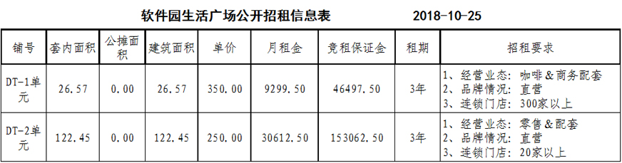 招租要求:詳見(jiàn)附表(軟件園生活廣場(chǎng)公開(kāi)招租信息表)
