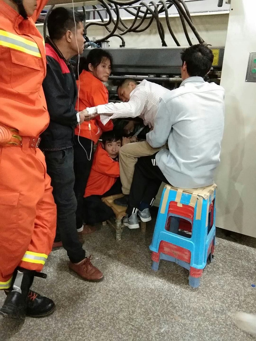 一個(gè)普通工人的手臂牽動(dòng)著(zhù)業(yè)主、物業(yè)管理人、消防官兵、120救援中心的心。因為機臺大,切割產(chǎn)生的高溫和火花易對傷者造成二次傷害,救援難度極大。救援小組迅速調整方案,用液壓擴張器將轉軸與機壁頂開(kāi),經(jīng)過(guò)半個(gè)多小時(shí)的不懈努力,傷者成功脫險,最終保住了手臂。